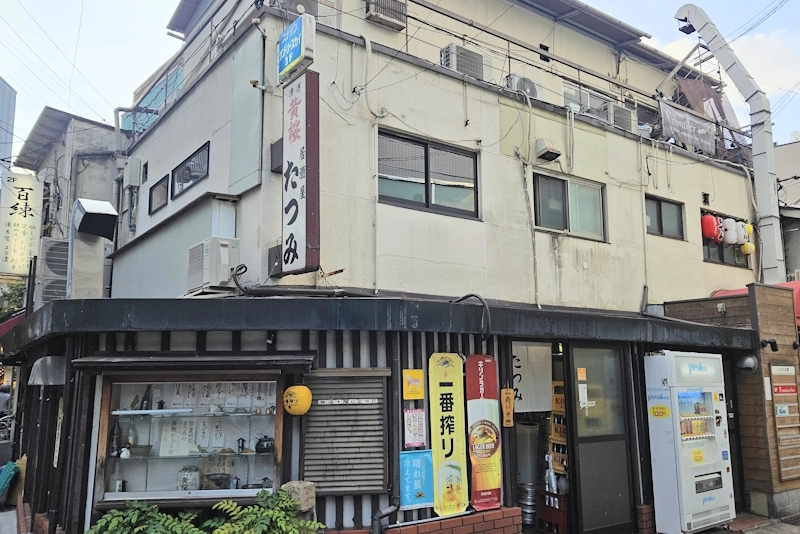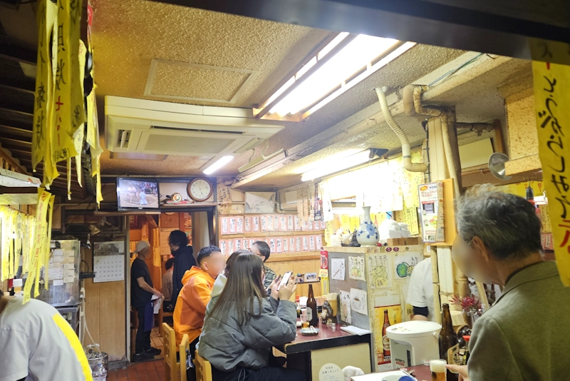 縄文展を見たあとは京都の友人と久しぶりに会って昼飲みとなり、四条河原町の裏手の「たつみ」へ。立ち飲みメインのお店ですが今日は腰が痛くてカウンター席をお願いしました。この店は50年前の学生時代に既にありましたが、学生の身で店飲みもできず卒業後に1、2回行ったことがあります。外観もさることながら店の中は昭和の居酒屋そのもの。ただ外国人のお客さんも数組いるところが昔とは違います。